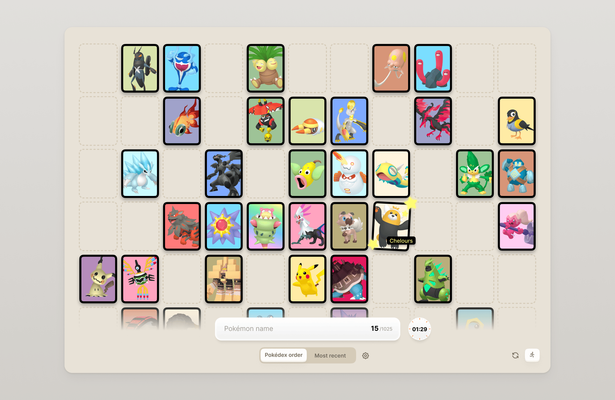 Memodex is a web-based game I designed as a side project, where players must name every Pokémon from memory. The gameplay is intentionally simple yet engaging, enhanced by playful details and thoughtful micro-interactions.