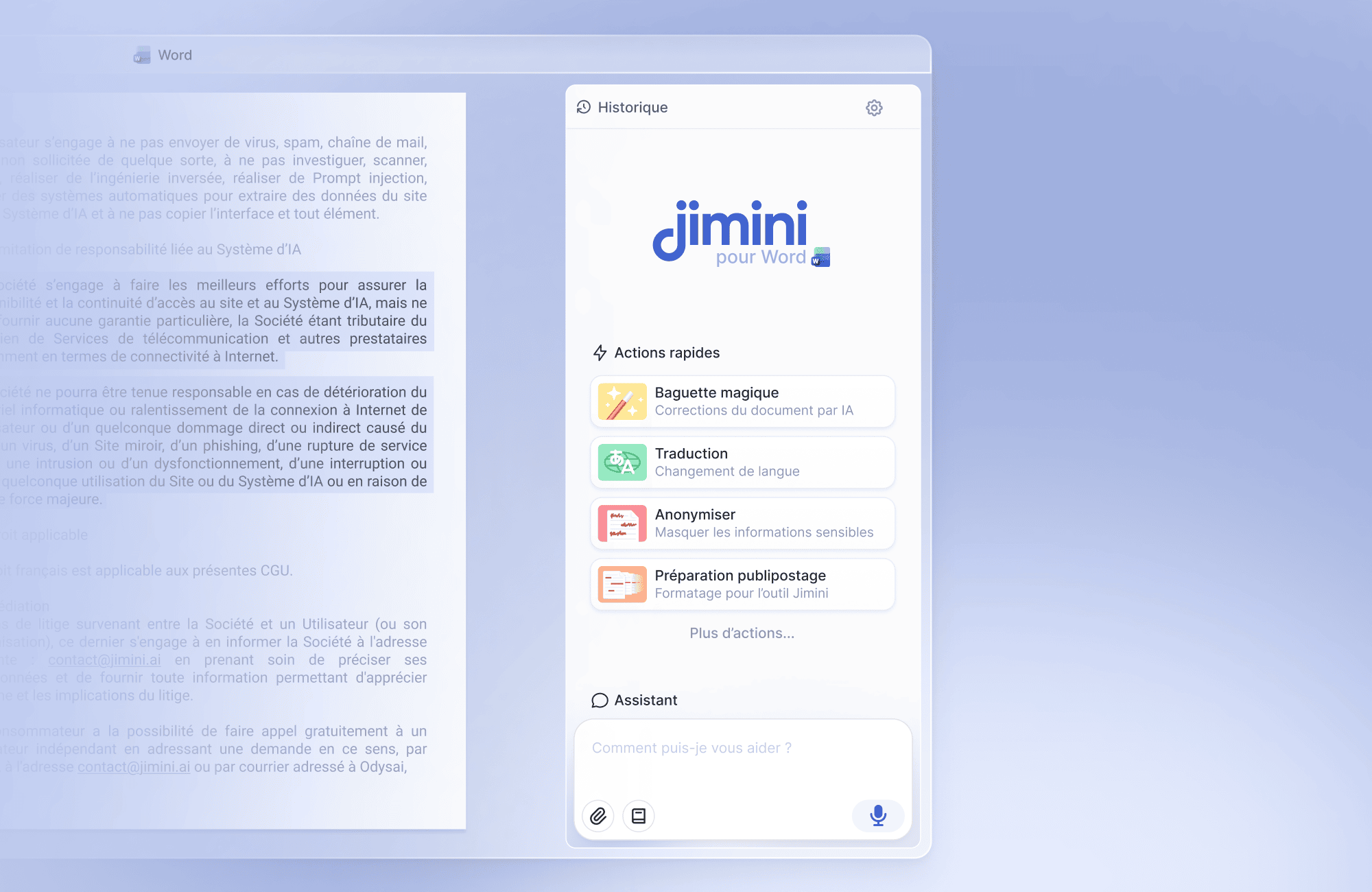 Jimini is an LLM-based SaaS solution dedicated to legal professionals. Over the past year, my primary mission was to turn the beta version into a fully functional product with an intuitive user interface. It is now used by thousands of lawyers across France.